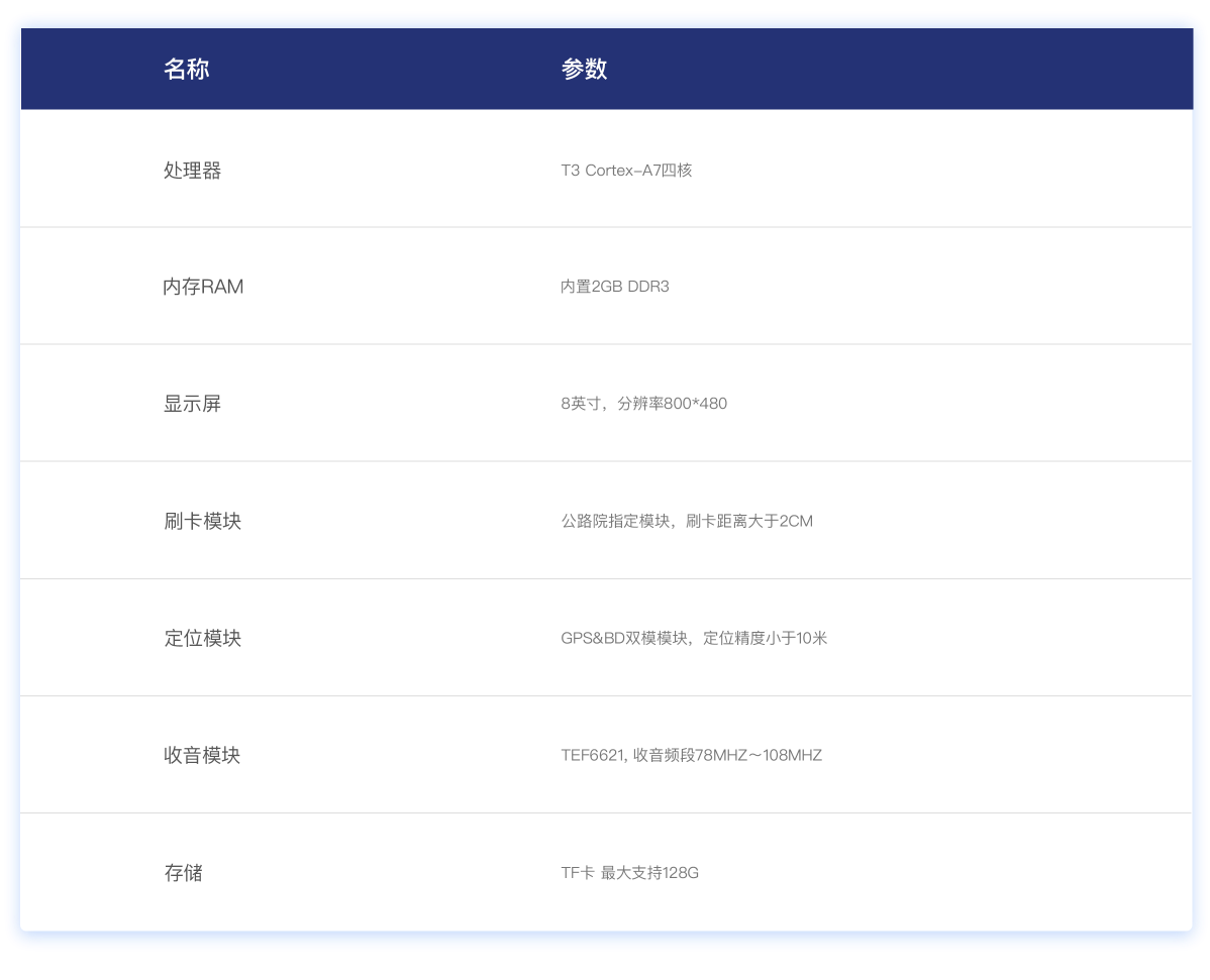 本產(chǎn)品是一款適用于出租車行業(yè)的一套系統(tǒng)解決方案產(chǎn)品,該產(chǎn)品基于 Android 4.4.2操作系統(tǒng),采用Cortex-A7四核車規(guī)級處理器,主頻高達1.2GHz;2GB運行內(nèi)存,內(nèi)置8GB的存儲空間;該產(chǎn)品內(nèi)置GPS&BD雙模模塊,4G通訊模塊,RFID模塊,藍牙、WIFI等無線傳輸模塊,可實現(xiàn)定位、導航、電召、通話、評價、刷卡等功能。