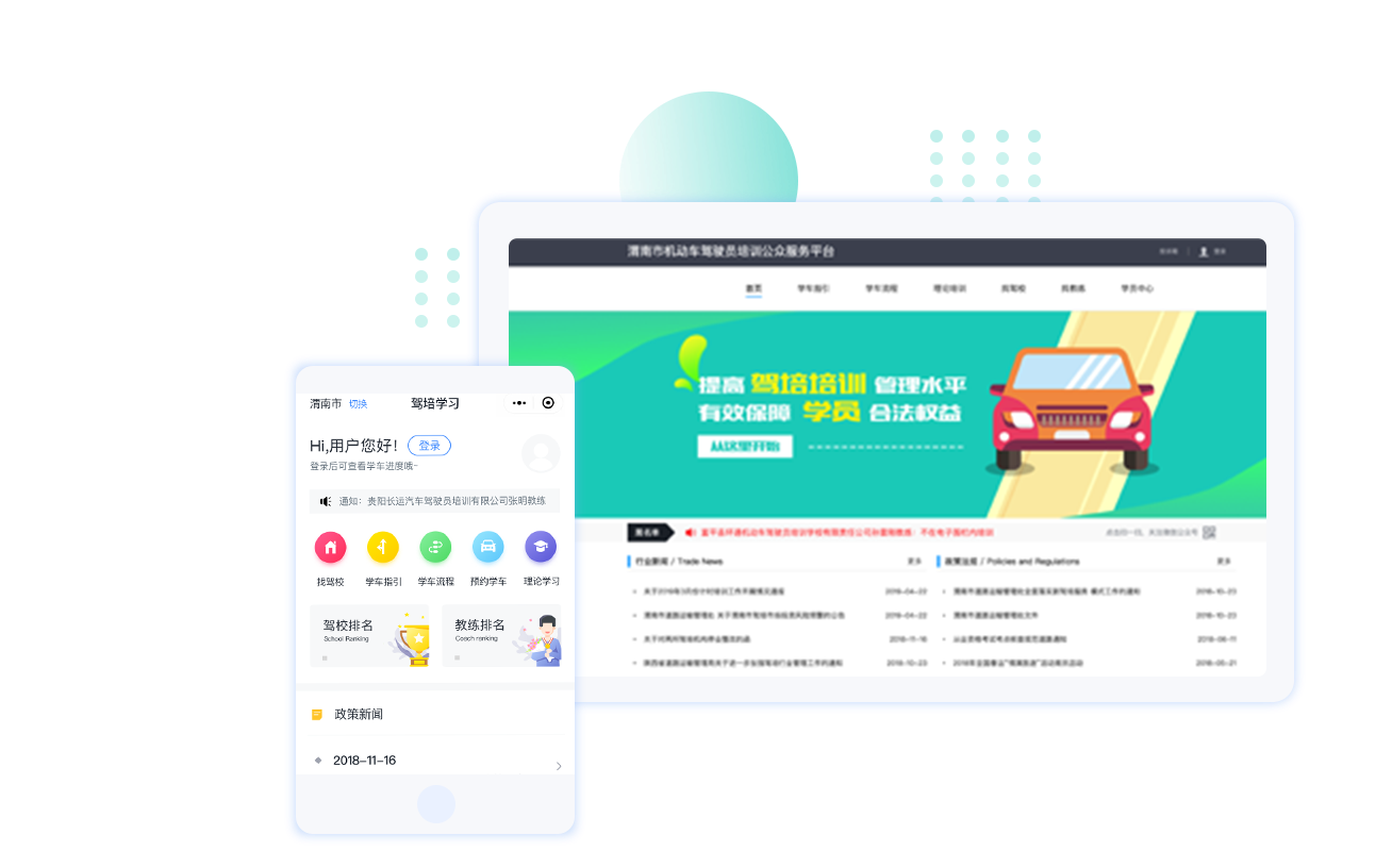 平臺(tái)與終端要符合交通部關(guān)于《機(jī)動(dòng)車駕駛員計(jì)時(shí)培訓(xùn)系統(tǒng)平臺(tái)技術(shù)規(guī)范》和《機(jī)動(dòng)車駕駛員計(jì)時(shí)培訓(xùn)系統(tǒng)計(jì)時(shí)終端技術(shù)規(guī)范》,公眾服務(wù)平臺(tái)支持交通通行新規(guī)”先學(xué)后付款,計(jì)時(shí)收費(fèi)“模式